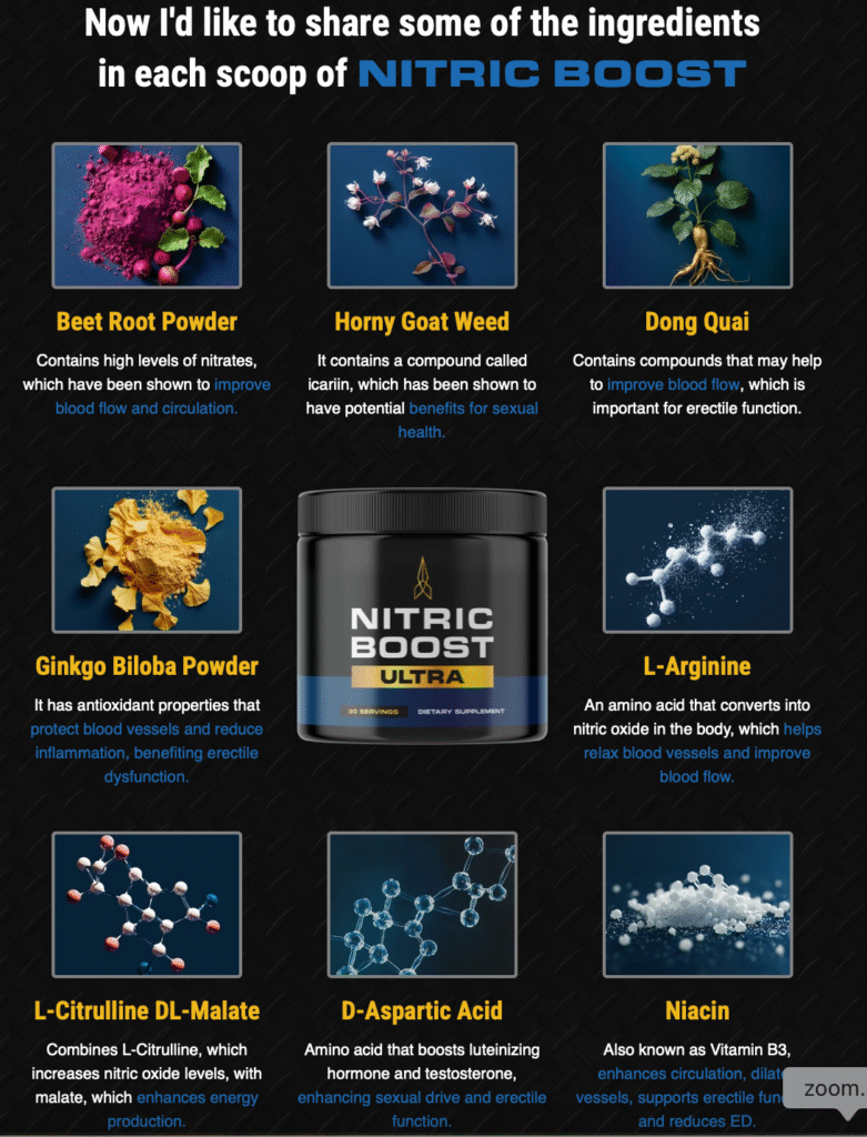 Nitric Boost is formulated with a blend of naturally sourced compounds and amino acids commonly used in supplements that support circulation, vascular function, and nitric oxide availability. Full ingredient details and directions for use are listed on the official website.
